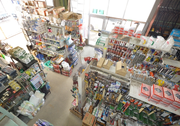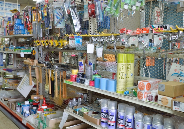 管工機材(パイプ類、配管工具、ポンプ類)、機械工具、電動工具、空気工具、工作機械、伝導装置用品、ボルト・ナット、砥石、金物類(建築用金具、家庭用品、農作業用品)、ビニールホース、ポリタンク、園芸用品など
